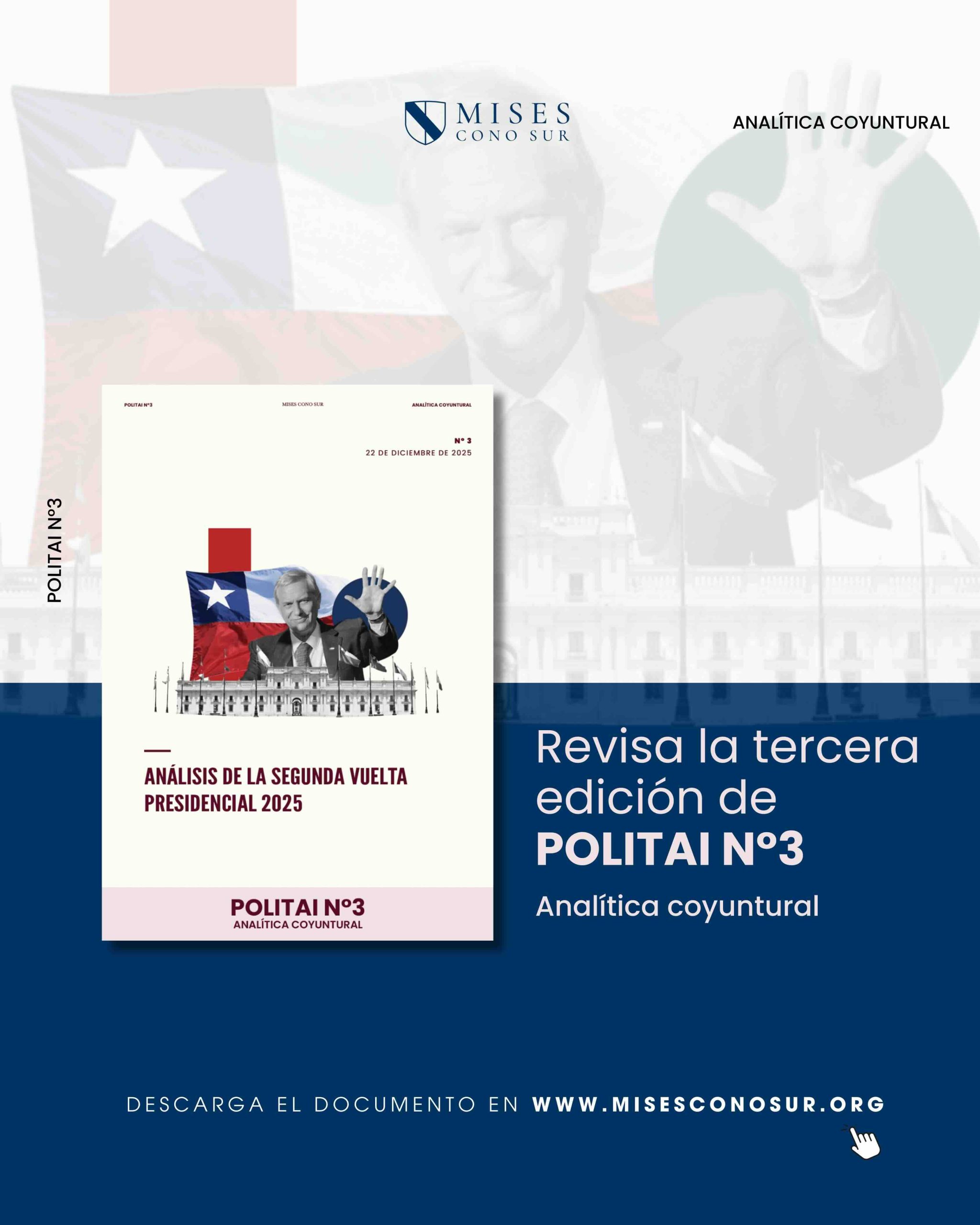 El Instituto Mises Cono Sur presentó la tercera edición de POLITAI – Analítica Coyuntural, titulada “Análisis de la segunda vuelta presidencial 2025” , un informe que examina en profundidad el balotaje que dio como vencedor al candidato del Partido Republicano, José Antonio Kast, con el 58,16 % de los votos, frente a la candidata comunista Jeannette Jara, quien obtuvo el 41,84 % de las preferencias