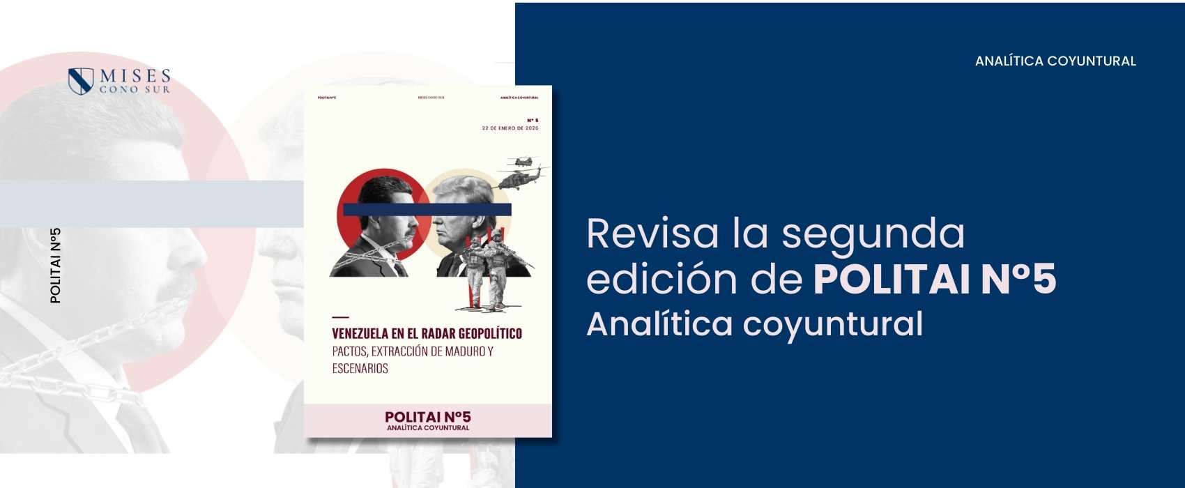 El Instituto Mises Cono Sur presentó la quinta edición de POLITAI – Analítica Coyuntural, titulada “Venezuela en el radar geopolítico: pactos, extracción de Maduro y escenarios”, un documento elaborado por Eugenio Guerrero, Director de Divulgación del Instituto, que analiza en profundidad la crisis venezolana desde una perspectiva histórica, política y geoestratégica.